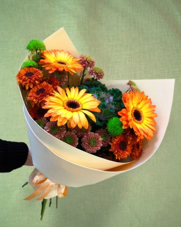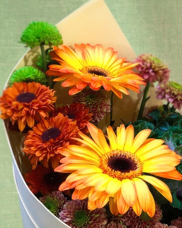 3 Розы Голландские, 2 Ириса Блю Мэджик, 2 Герберы, 3 Хризантемы, 3 Хризантемы, 1 Гортензия